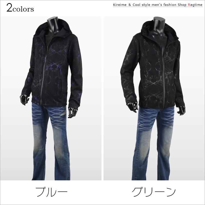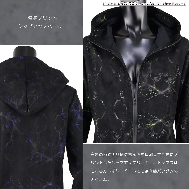 ストレッチ ジップアップ パーカー 長袖 メンズ 雷柄 プリント 蛍光 K291222-05
