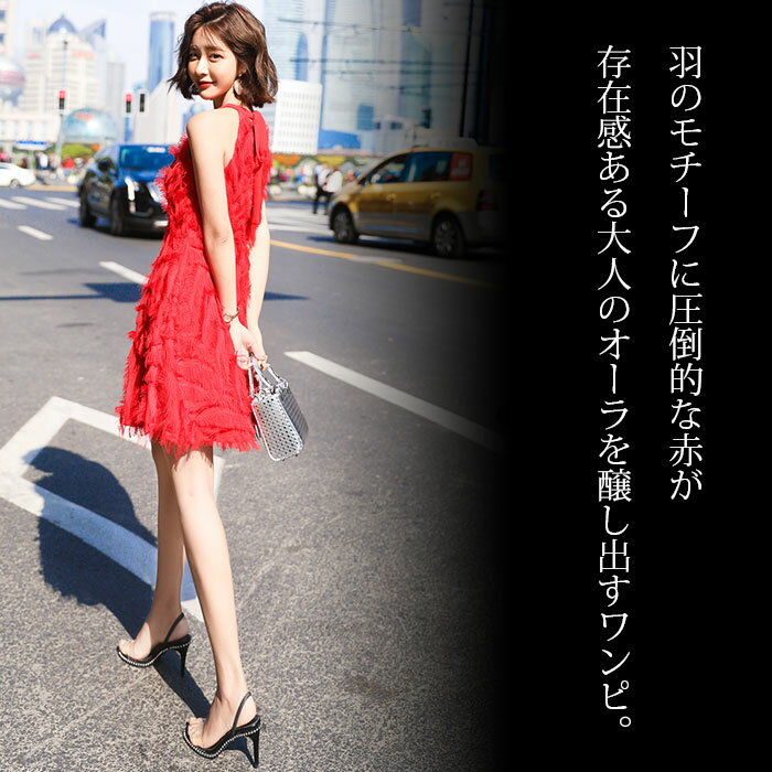 商品番号 ch5-3021 サイズ(cm)※B/W/Hは推奨サイズ ■S着丈:77 / B:78-82 / W:60-64 / H:80-84■M着丈:78 / B:82-86 / W:64-68 / H:84-88■L着丈:79 / B:86-90 / W:68-72 / H:88-92 カラー レッド 素材 / 伸縮性 ポリエステル / 伸縮性なし モデル身長 167cm / S着 詳細 全体を羽毛風モチーフで覆い、さらに赤色カラーを使用することで圧倒的な存在感を打ち出す、ショート丈のドレスワンピースです。