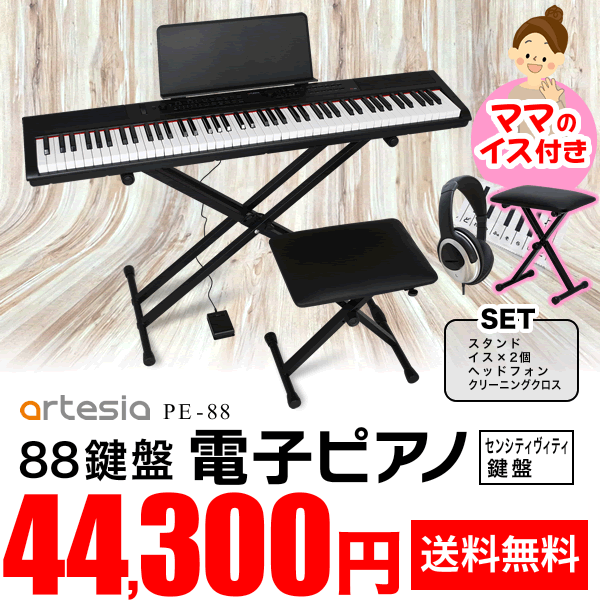 電子ピアノ Artesia PE-88 スタンド・イス×2・ヘッドフォン・クリーニングクロスセット【デジタルピアノ 88鍵盤 センシティビティキー フルサイズ 初心者 キーボード PE88 アーティシア アーテシア アルテシア】【発送区分:大型 ※沖縄・離島は特殊送料】